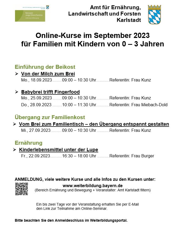 Einführung der Beikost ➢ Von der Milch zum Brei Mo., 18.09.2023 09:00 – 10:30 Uhr Referentin: Frau Kunz ➢ Babybrei trifft Fingerfood Mo., 25.09.2023 09:00 – 10:30 Uhr Referentin: Frau Kunz Do., 28.09.2023 10:00 – 11:30 Uhr Referentin: Frau Miebach-Dold