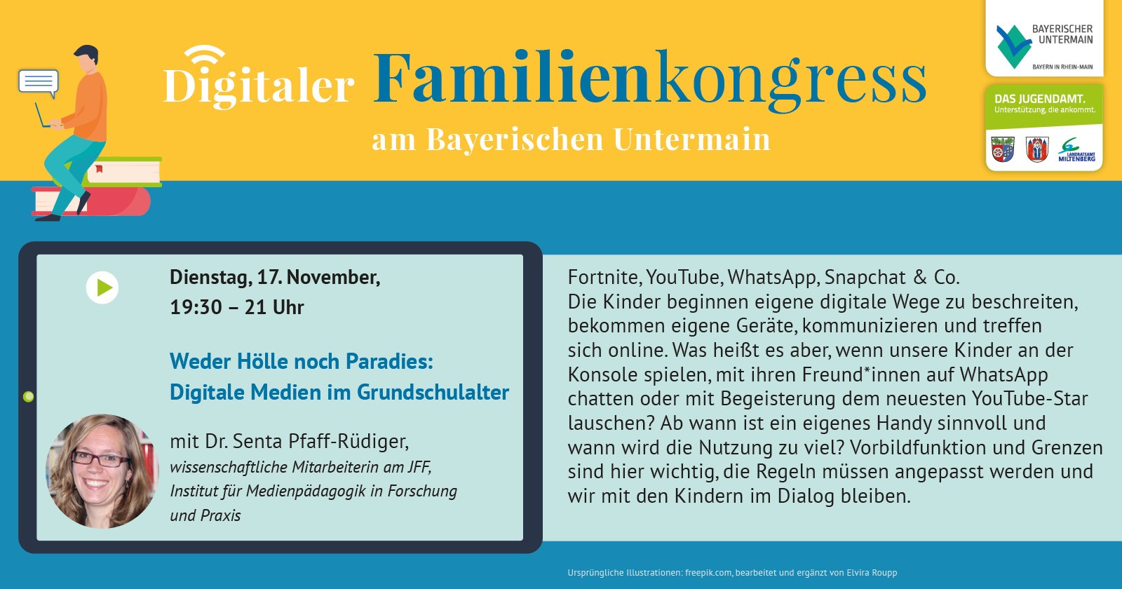 Fortnite, YouTube, WhatsApp, Snapchat CO. Die Kinder beginnen eigene digitale Wege zu beschreiten, bekommen eigene Geräte, kommunizieren und treffen sich online. Was heißt es aber, wenn unsere Kinder an der Konsole spielen, mit ihren Freund*innen auf WhatsApp chatten oder mit Begeisterung dem neuesten YouTube-Star lauschen? Ab wann ist ein eigenes Handy sinnvoll und wann wird die Nutzung zu viel? Vorbildfunktion und Grenzen sind hier wichtig, die Regeln müssen angepasst werden und wir mit den Kinder im Dialog bleiben.